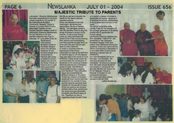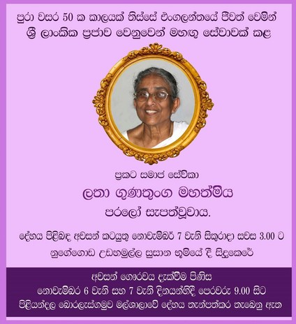 For over 5 decades, being a resident in Letchworth Garden City, in the United Kingdom, Mrs Latha Gunatunga rendered a great service to the local community of Great Britain, Sri Lanka and Buddhism.