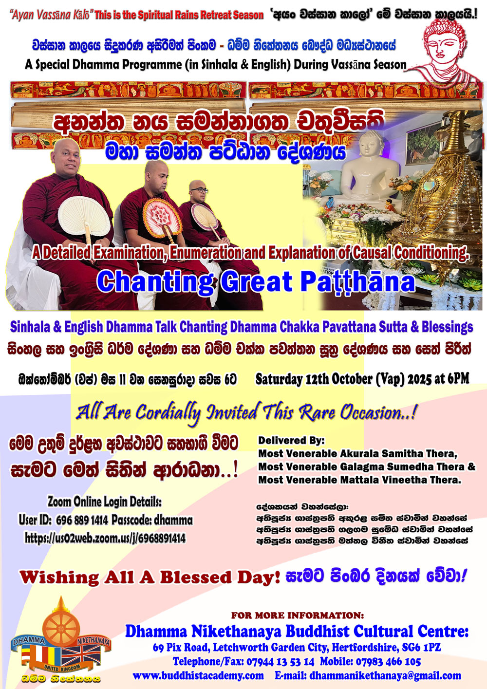 Devotees are welcome to participate weekly Special Pooja, Chanting Protection Blessings (Seth Pirith), Monthly Full Moon Day Programmes, Meditation Retreats, Dhamma Talks and many more blissful ceremonies during this Holy Three Months.