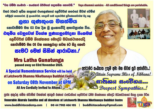 Mrs Latha Gunatunga Passed Away on 03rd November 2025. May She Attain Supreme Bliss of Nibbana!
